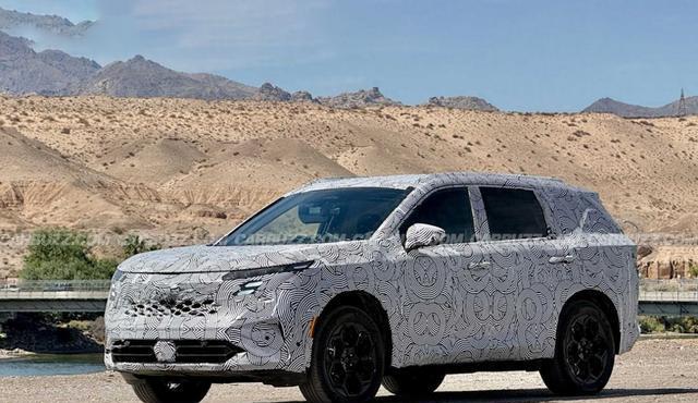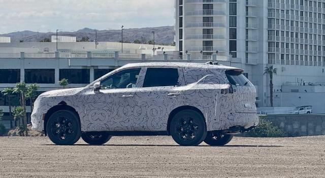 车身侧面线条从圆润转为锋利,平直腰线贯穿全车,C 柱至 D 柱的上扬线条与粗壮立柱营造出美式 SUV 的力量感,后翼子板新增折痕处理强化肌肉感。悬浮式车顶搭配传统门把手设计,兼顾时尚度与实用性,测试车配备的 19 英寸多辐轮毂,轮胎尺寸预计为 235/55 R19,进一步提升离地间隙与通过性。尾部虽被伪装覆盖,但可见尾灯与后风挡衔接的布局得以保留,灯组内部或采用矩阵式光源,整体风格更趋简约大气。