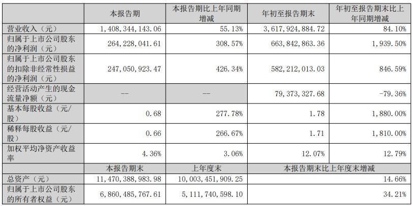 前三季度新强联实现营业收入36.18亿元,同比增长84.1%,归母净利润6.64亿元,同比增长1939.5%。第三季度营业收入14.08亿元,同比增长55.13%,归母净利润2.64亿元,同比增长308.57%。营业收入增长主要系销售收入增长所致。
